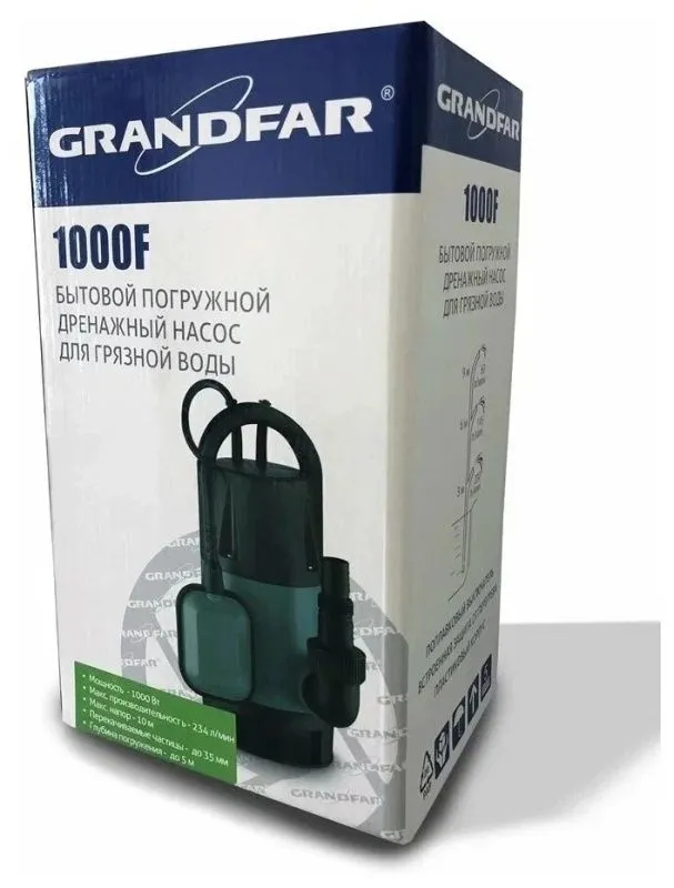 Насос Grandfar 1000F дренажный для грязной воды предназначен для выкачивания воды из колодцев, рек откачки грунтовых вод при подтоплении подвальных помещений, откачки ливневых стоков, откачки бытовых стоков, не содержащих крупные частицы, откачки воды из бассейнов и водоёмов, подачи воды на искусственные водопады и фонтаны, откачки любых загрязненных жидкостей содержащих частицы по диаметру не превышающие предельно-допустимых размеров для используемого насоса. Насос снабжен поплавковым выключателем, автоматически отключающим насос при отсутствии жидкости и автоматически включающим насос при наличии жидкости для перекачивания.