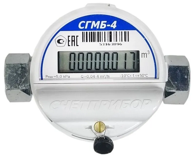 Счетчик бытовой СГМБ-4 производства ЗАО Счетприбор с возможностью замены элемента питания (батареи) без снятия самого счетчика, благодаря вынесенному батарейному отсеку на лицевую сторону счетчика и дополнительно опломбированному для защиты. Процедуру вскрытия пломбы и замены батареи праве производить специализированные монтажные организации занимающиеся организацией работ по газу. СГМБ-4 предназначен для измерения проходящего через него объема газа косвенным методом измерения по средствам измерения частоты и количества автоколебаний, создаваемых струйным автогенератором, пропорциональных расходу и объему газа, прошедшего через счетчик. (природного газа по ГОСТ 5542-87, сжиженного газа по ГОСТ 20448-90 и других газов, не агрессивных к материалам счетчика).Малогабаритный счетчик газа СГМБ-4 для присоединения к системе газового трубопровода оснащен двумя гайками с резьбой 3/4 дюйма с каждой стороны, что упрощает его монтаж, а так же дает возможность заменить счетчики других производителей, например Гранд-4.