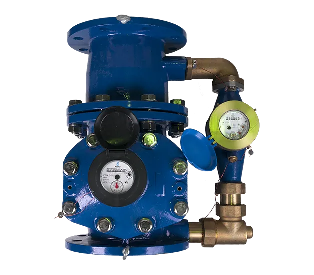 - Конструктивно в устройстве расположены два счетчика: турбинный счетчик для больших расходов, многоструйный крыльчатый счетчик для малых расходов. За счет этого достигается возможность точного измерения на объектах с широким диапазоном как малых, так и больших расходов воды.